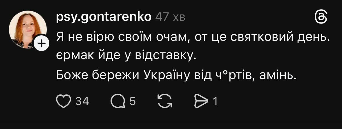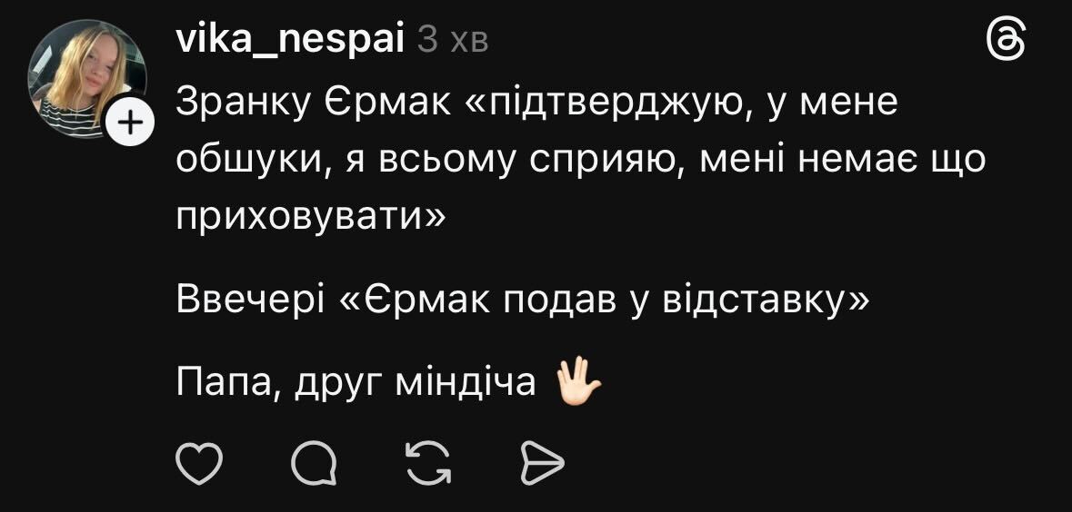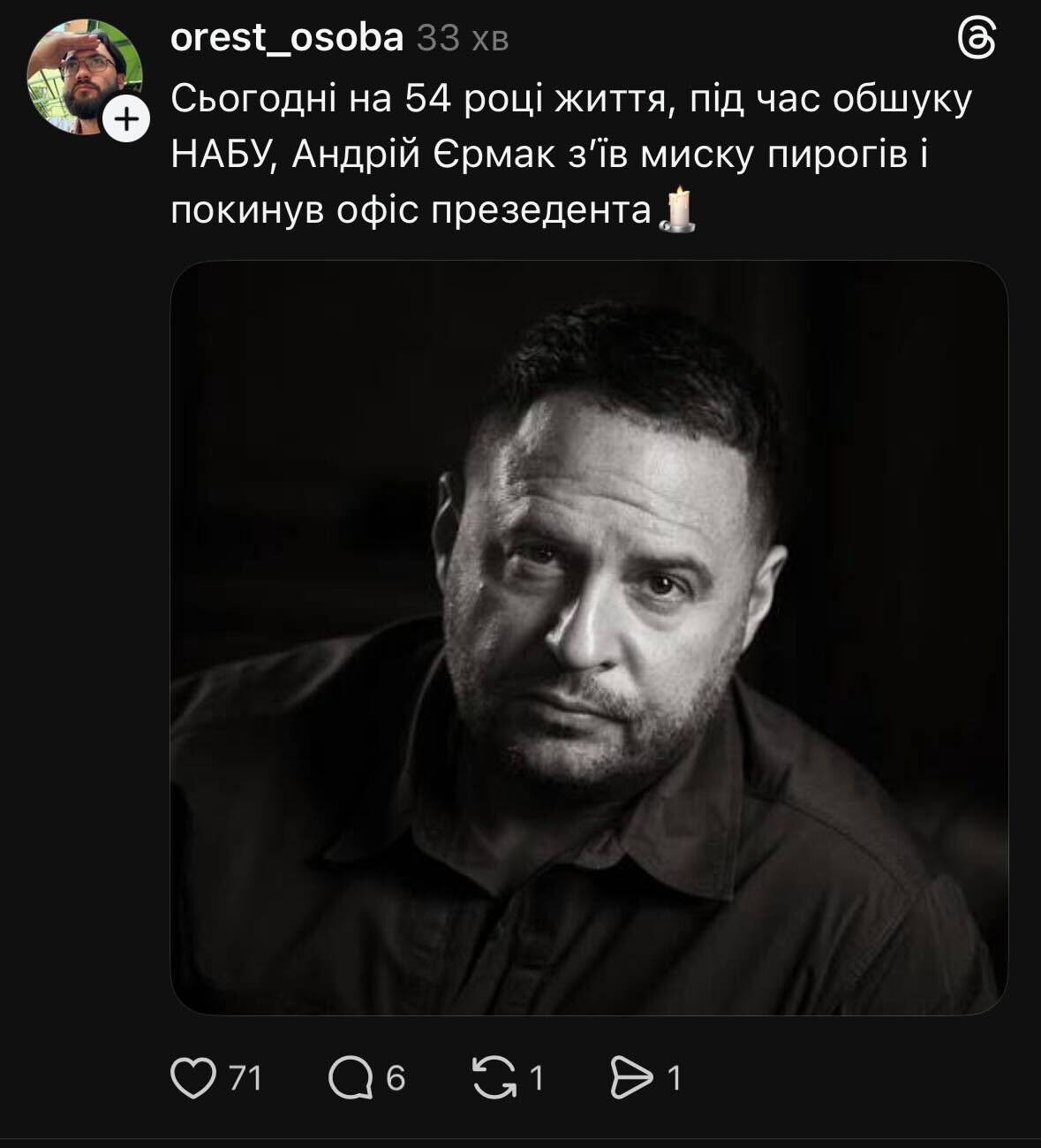 28 листопада у голови Офісу президента Андрія Єрмака пройшли обшуки, проведені НАБУ та САП. Увечері він написав заяву про відставку. Подію вже активно коментують у соцмережах.