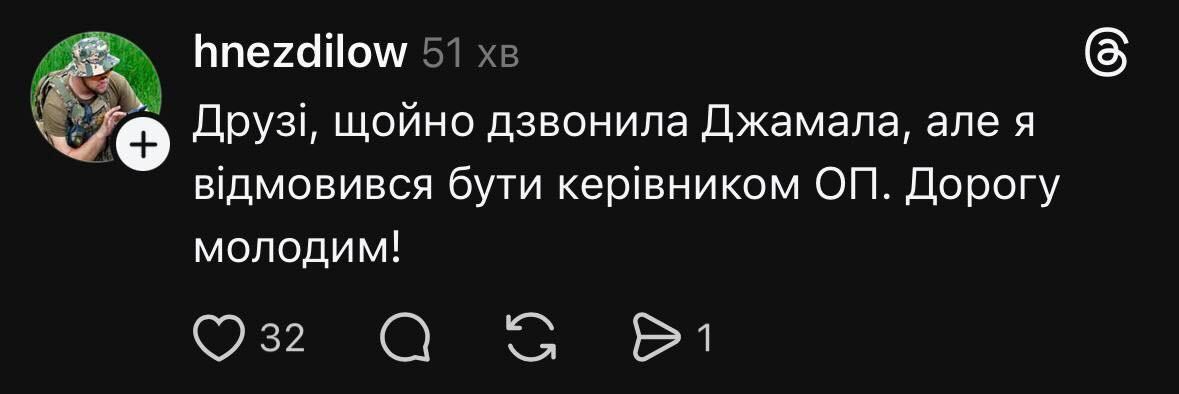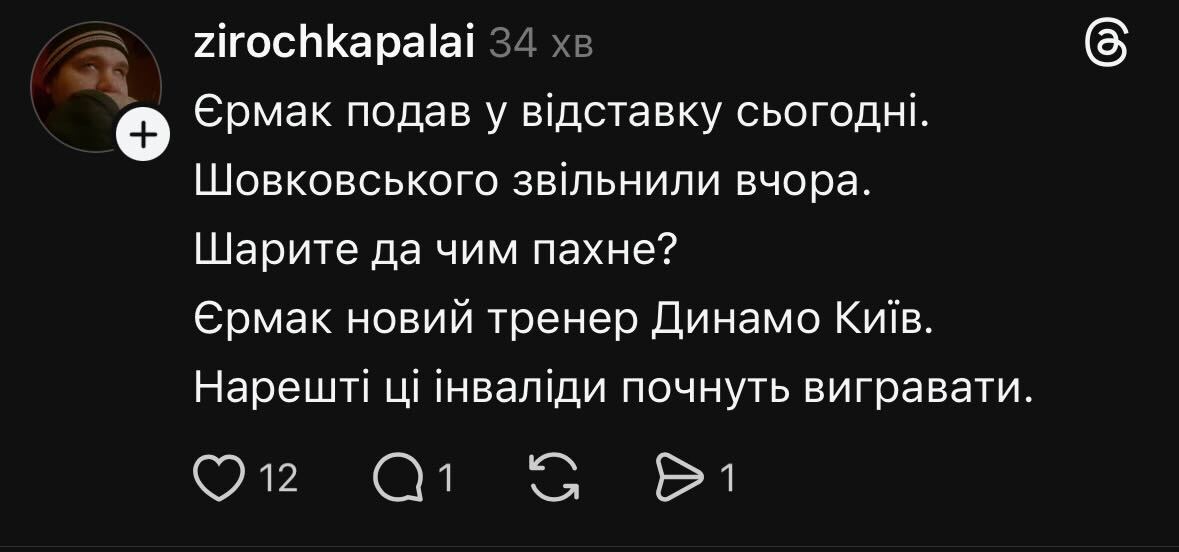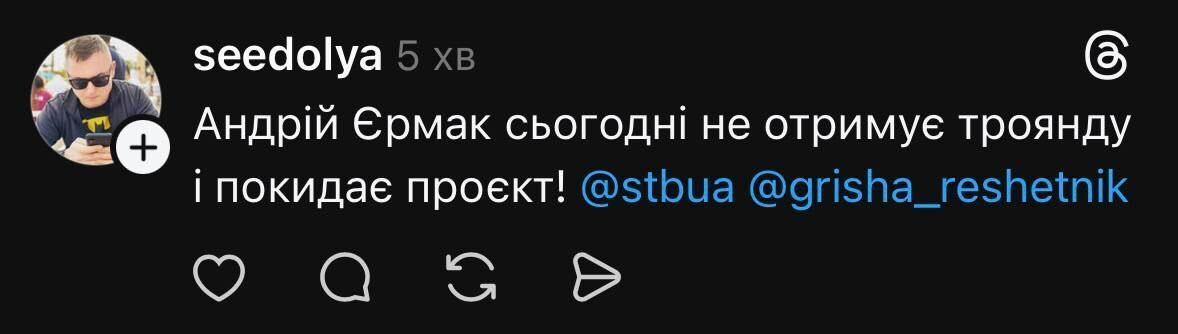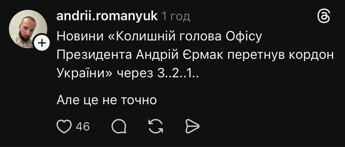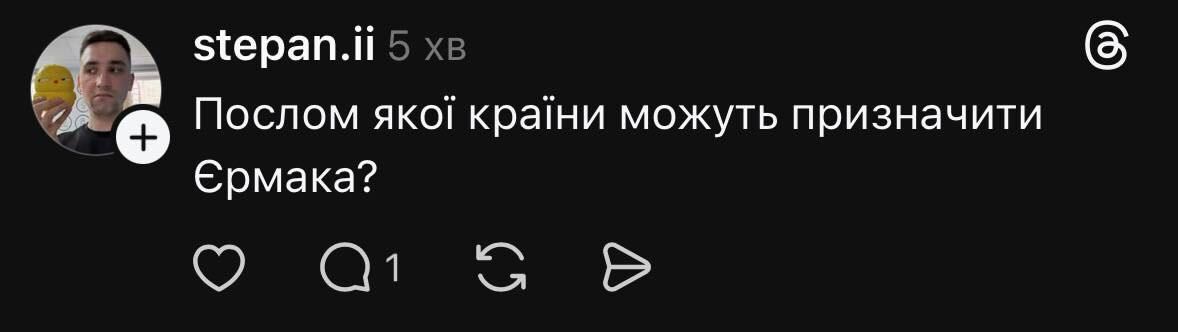 Один із користувачів припустив, що вже колишній голова Офісу Президента Андрій Єрмак незабаром виїде з України.