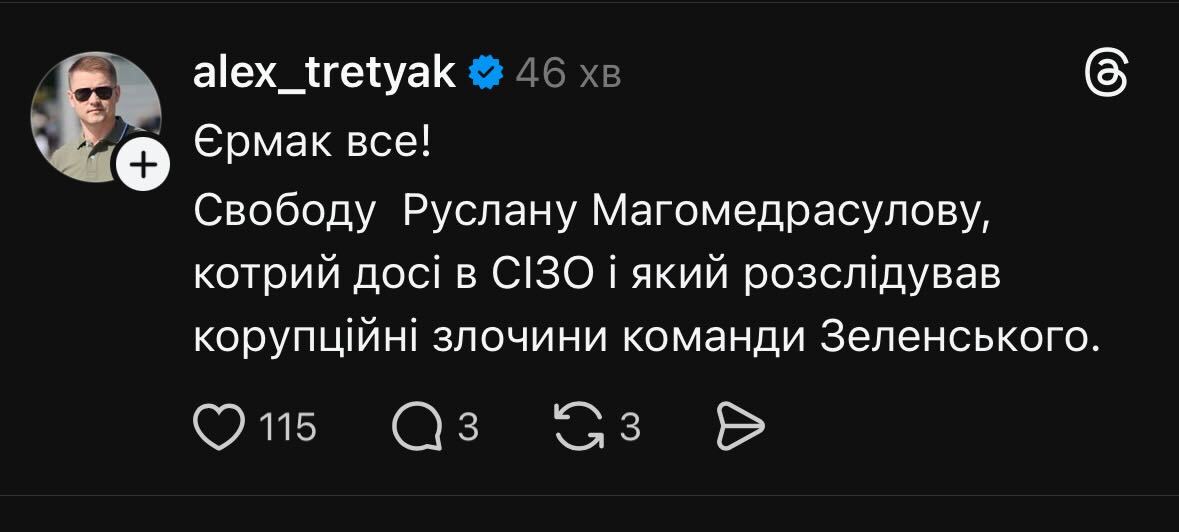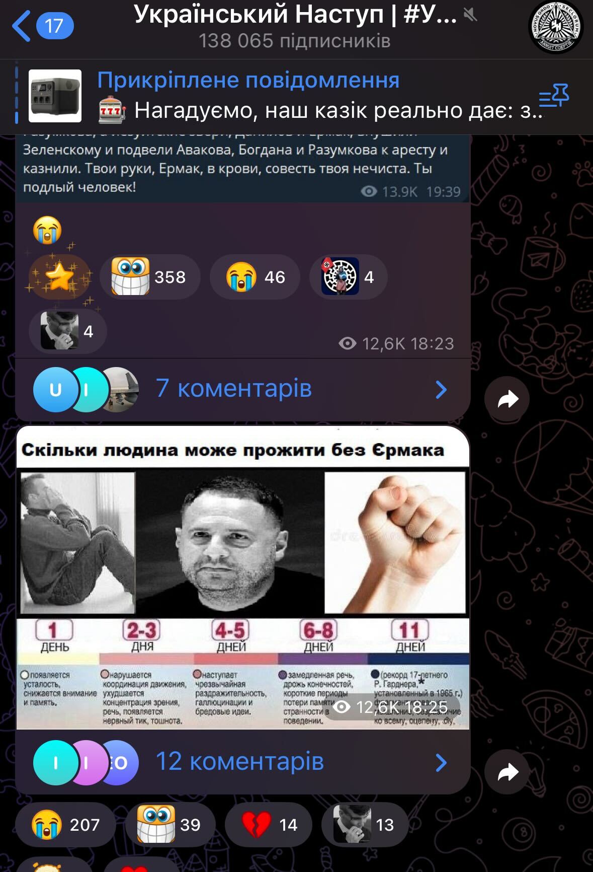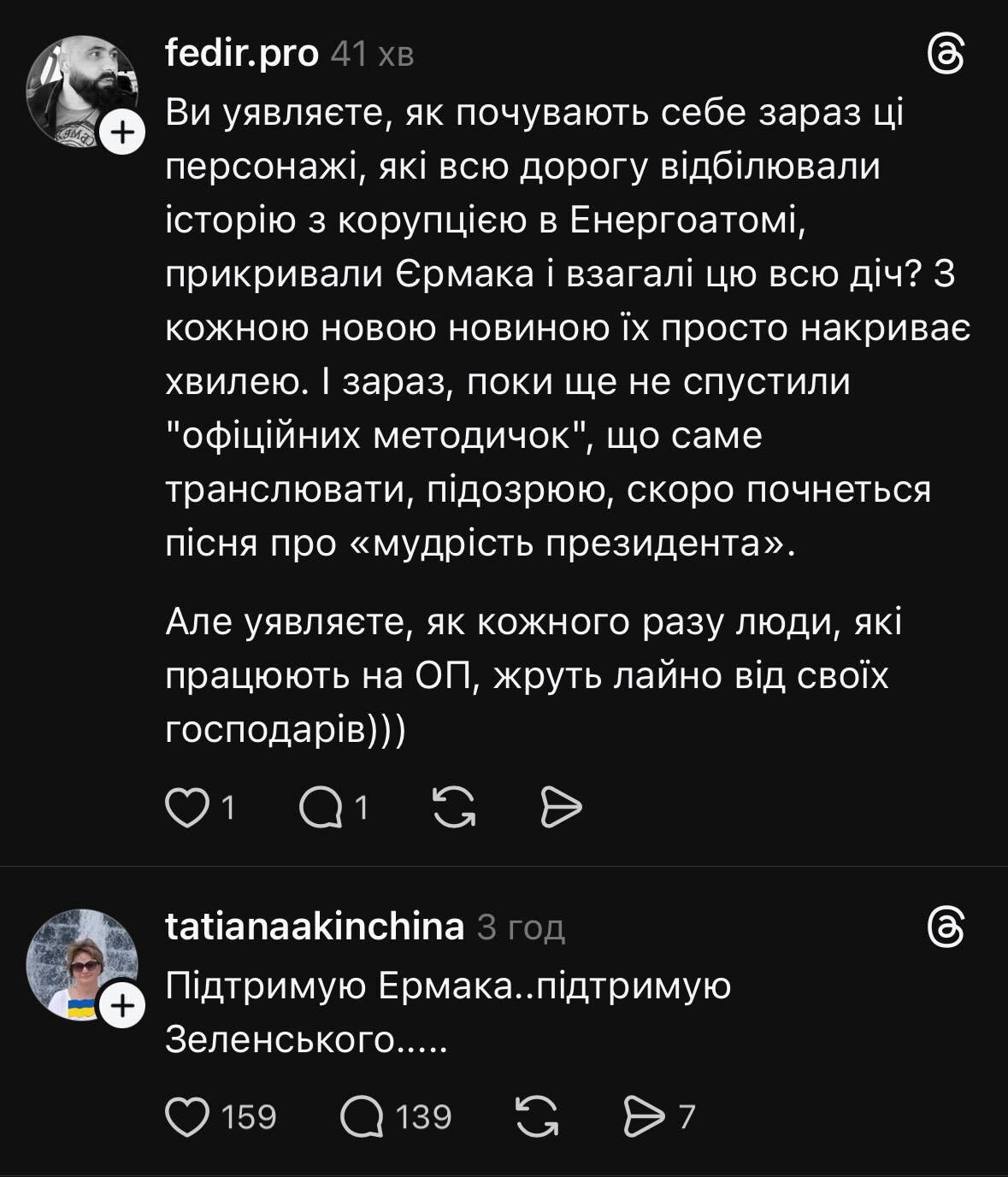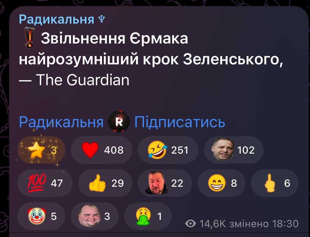Народний депутат Ярослав Железняк заявив, що голова Офісу Президента Андрій Єрмак має бути звільнений або сам піти у відставку. За словами депутата, Єрмак був тісно пов’язаний із корупційними схемами, зокрема у діяльності бізнес-групи Міндіча, і брав активну участь у ключових рішеннях.