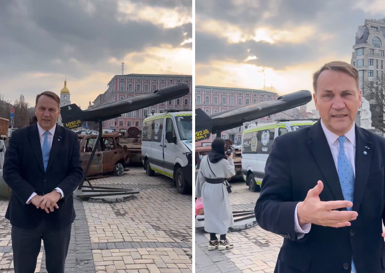 “За моєю спиною дрон “Герань”, тобто російська версія іранського Shahed. Сьогодні ми вже знаємо, що обидва театри двох воєн пов’язані один з одним саме цією машиною, що несе смерть. Спочатку Іран продавав ці дрони Росії, потім Росія почала виробляти їх за ліцензією, і сьогодні тисячі таких машин намагаються завдавати ударів по українських містах і теплоелектростанціях”, – заявив Радослав Сікорський.