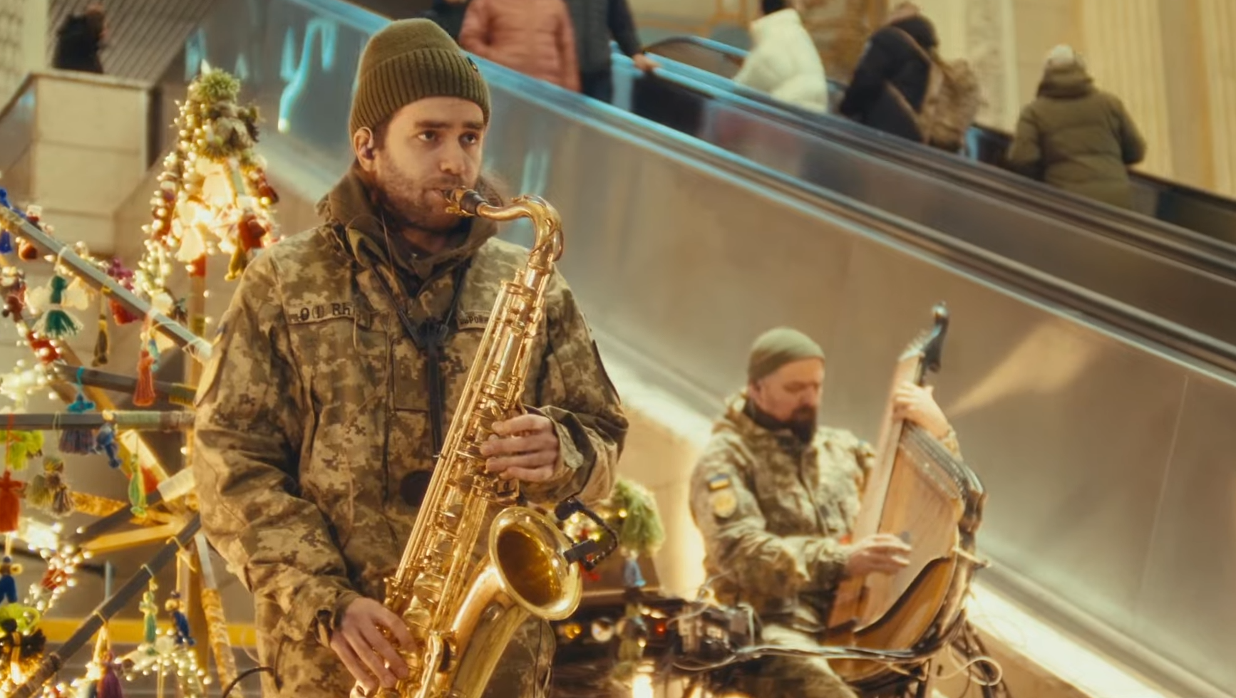 Військовослужбовці Культурних сил представили нову версію “Щедрика”, яку виконали на саксофоні та електробандурі на залізничному вокзалі Києва.