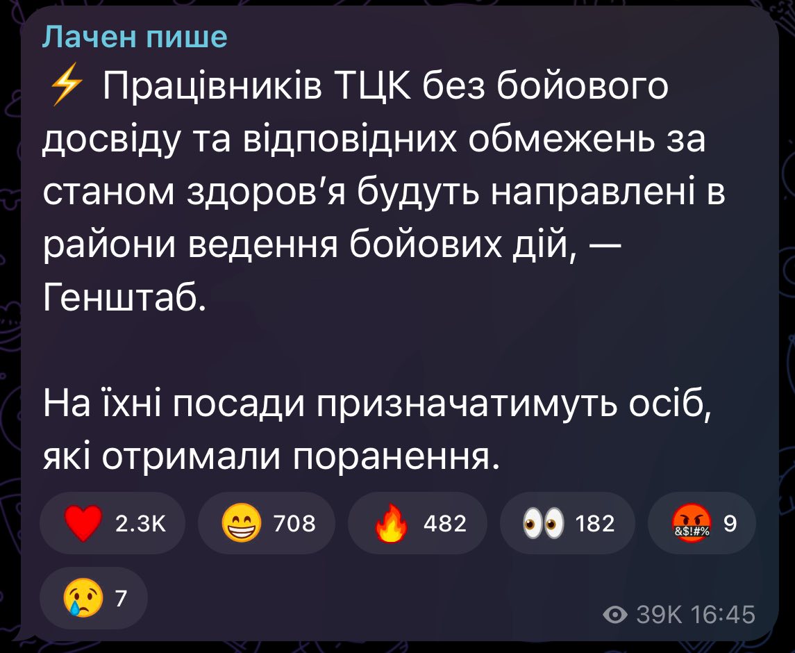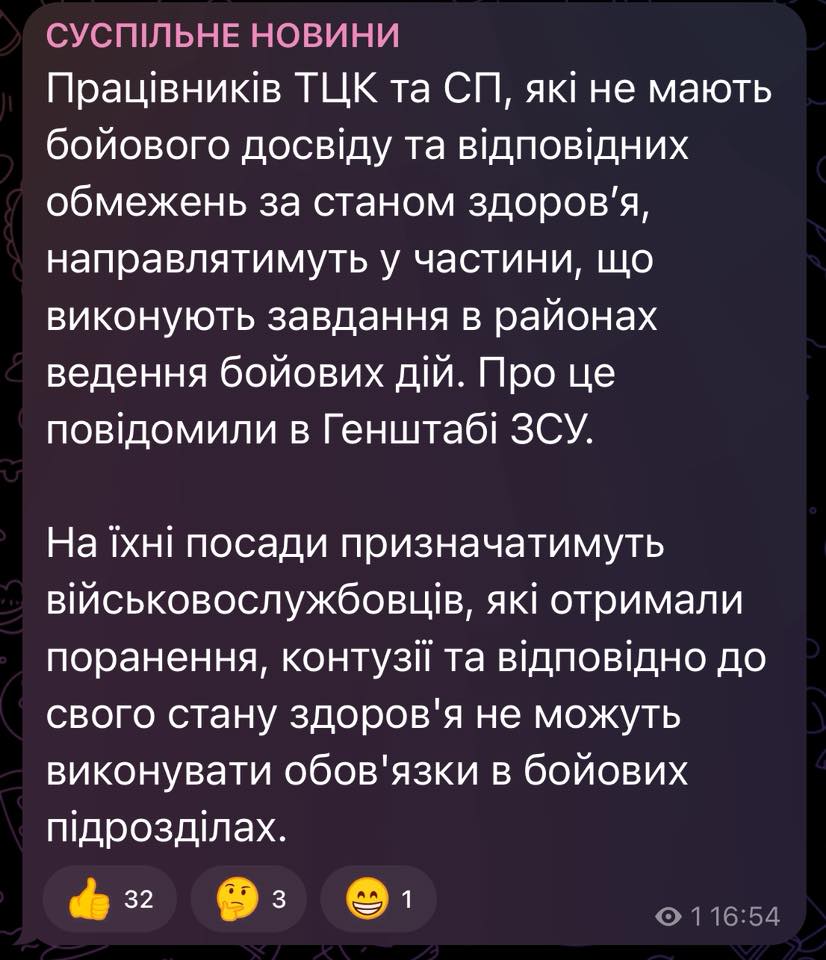 Раніше у Генштабі повідомили, що військовослужбовці ТЦК та СП без бойового досвіду та відповідних обмежень за станом здоров’я будуть направлені в райони ведення бойових дій.