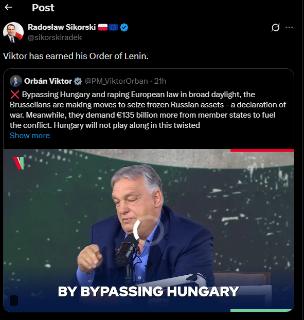 «Віктор отримав свій орден Леніна»: Сікорський розкритикував Орбана за проросійську позицію.