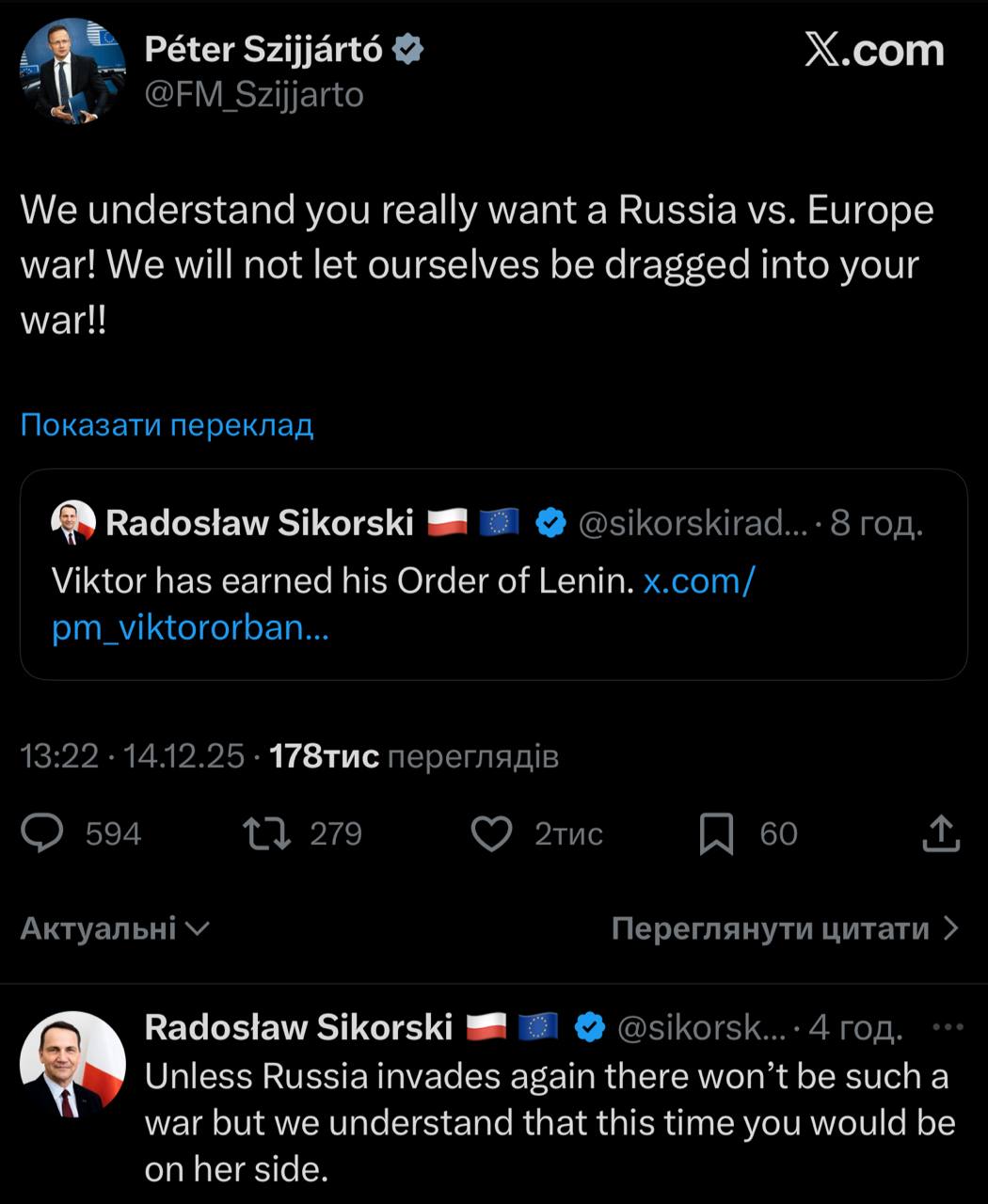 Міністр закордонних справ Польщі Радослав Сікорський різко розкритикував позицію Угорщини щодо Росії та війни в Україні. Обмін гострими репліками відбувся між ним та угорськими посадовцями у соціальній мережі X.
