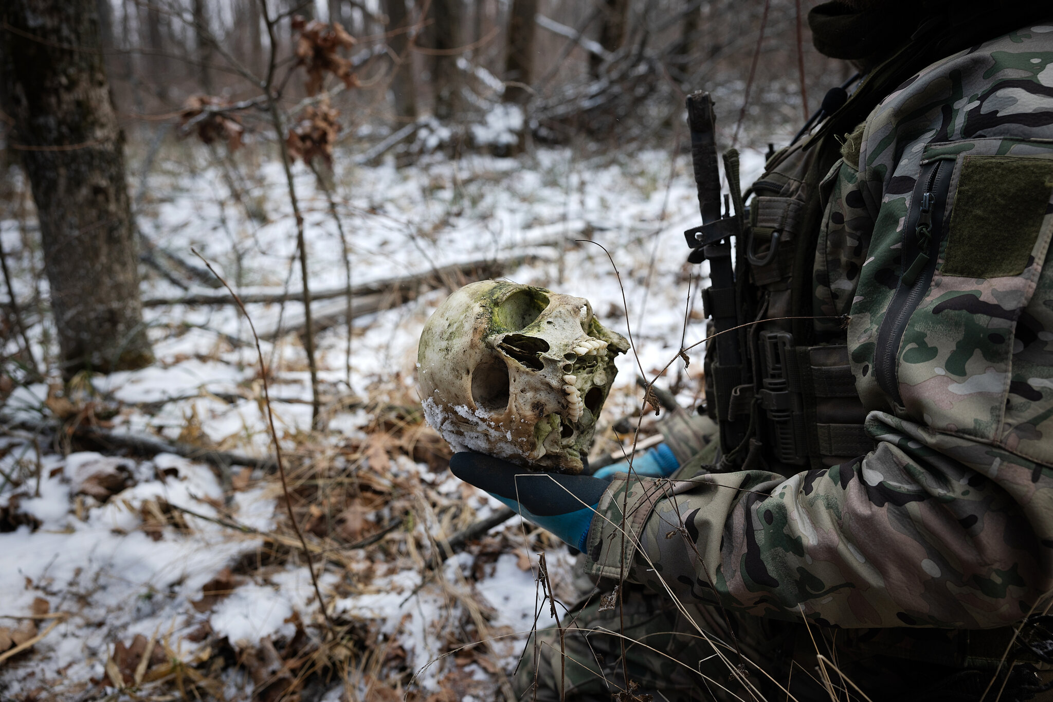 Волонтер пошукової групи “Плацдарм” збирає останки військових і цивільних, загиблих поблизу села Довгеньке на Харківщині – 9 лютого.