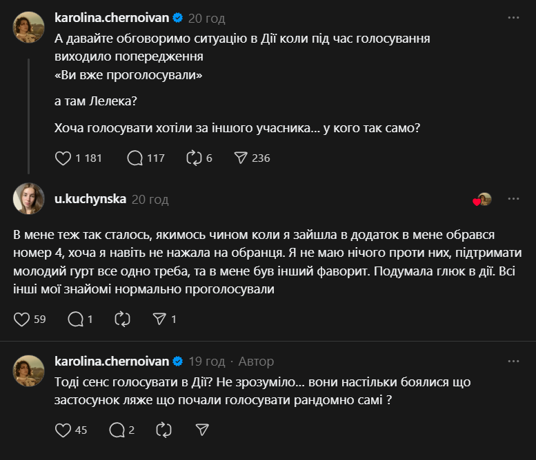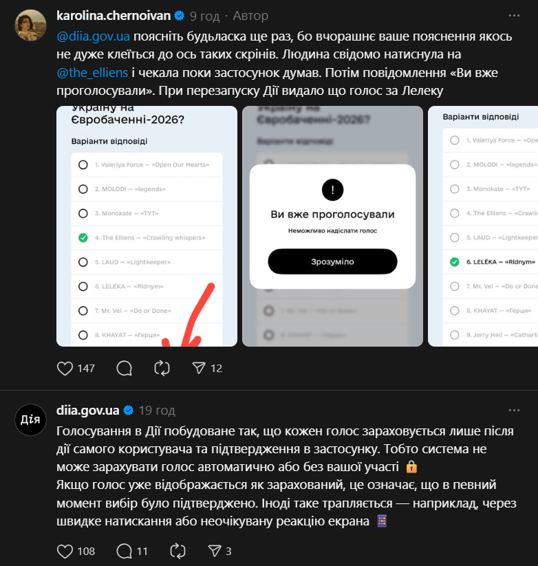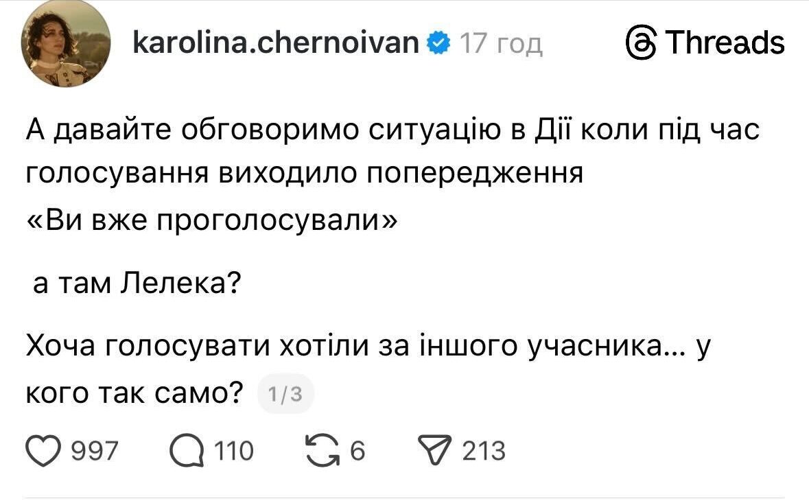 “Зайшла в Дію, щоб проголосувати… але “Ваш голос вже зараховано”. В сенсі? Я ще не голосувала! Поновлюю сторінку в Дії. Мій голос за Лелеку???”.