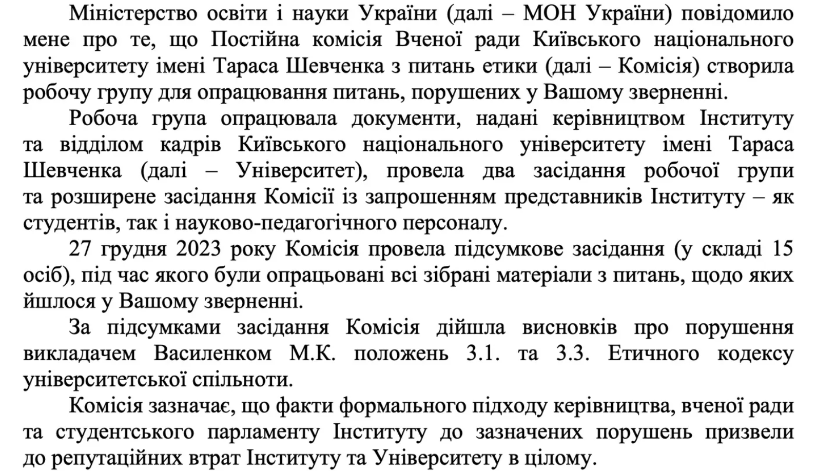 На підставі висновків комісії Микиті Василенку та очільниці кафедри, на якій він працює, винесли догану.