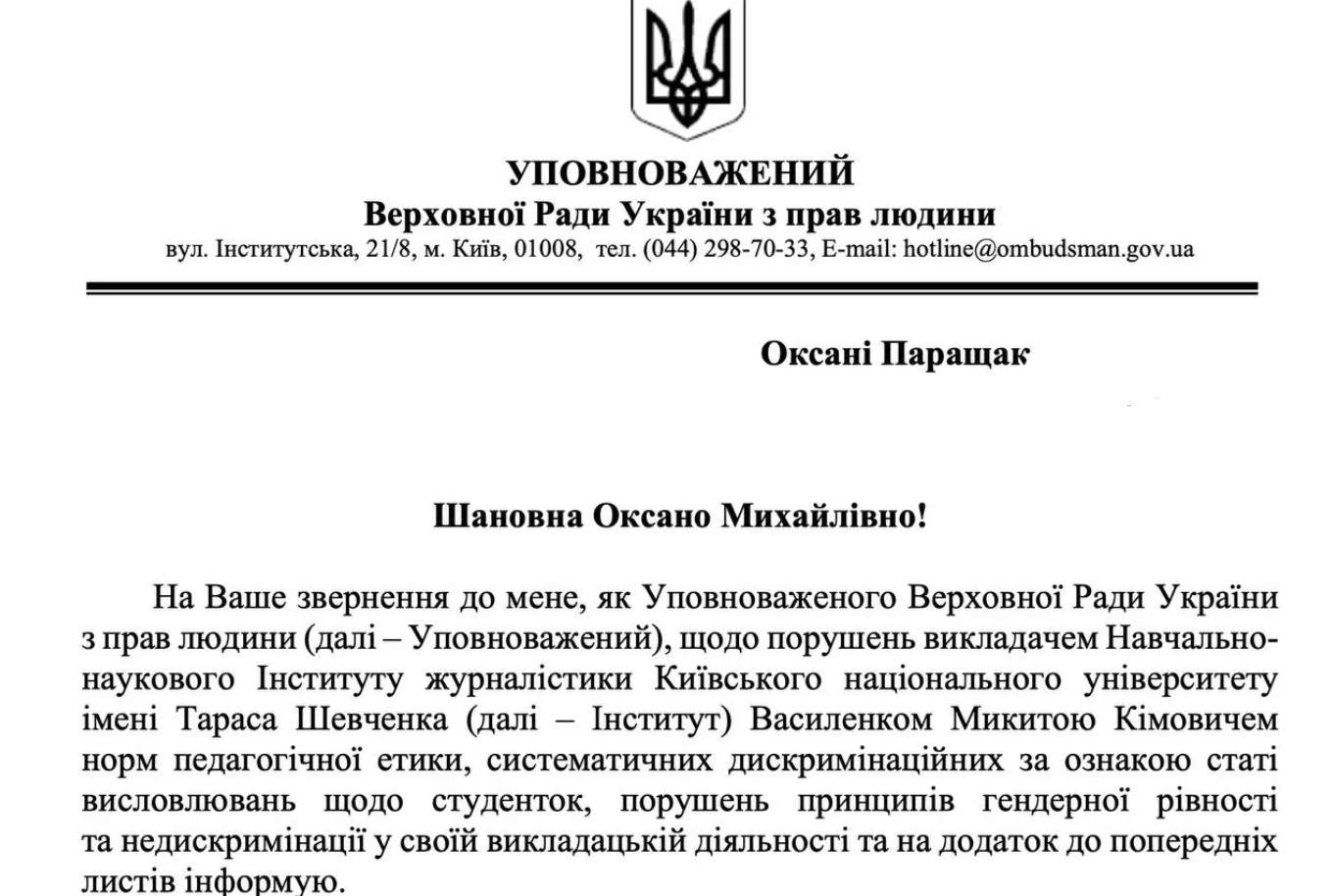 Оксана Паращак розповіла, що влітку минулого року студенти звернулися з листом до чинного на той час директора інституту Володимира Різуна. У листі студенти поскражилися на “відверту проросійську та сексистську позицію” Микити Василенка.