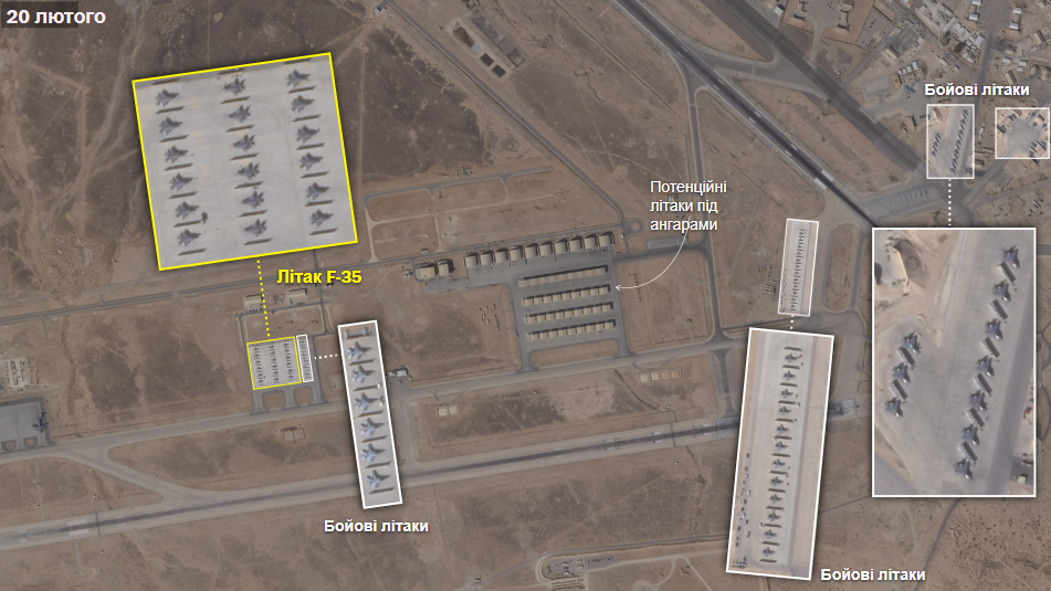 Супутникові знімки показують понад 60 бойових літаків на базі Muwaffaq Salti в Йорданії, серед яких більше десятка F-35. Ці винищувачі часто використовуються для атаки на протиповітряну оборону противника, створюючи безпечніший шлях для інших літаків. За словами аналітиків, цей малопомітний вдосконалений винищувач також оснащений засобами радіоелектронної боротьби.