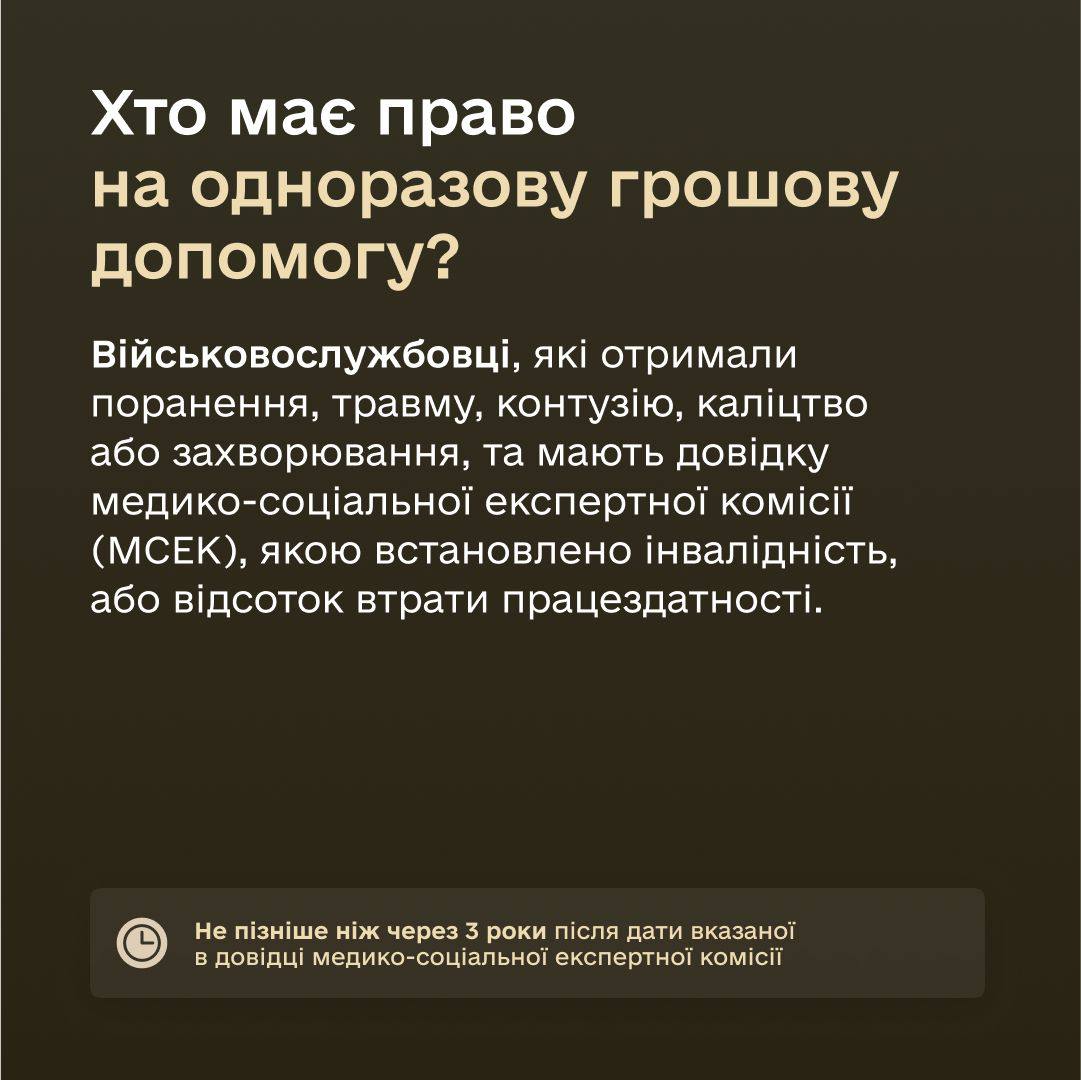 На одноразову грошову допомогу (ОГД) мають право військовослужбовці, які зазнали поранення, травми, контузії, каліцтва або захворювання, та мають довідку медико-соціальної експертної комісії (МСЕК), якою встановлено інвалідність, або відсоток втрати працездатності.