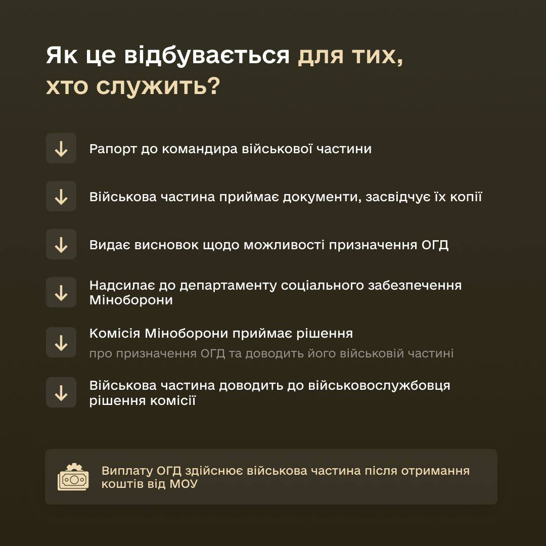 Тим, хто служить, потрібно подати відповідний рапорт до командира військової частини. Після цього військова частина приймає документи та засвідчує їх копії, видає висновок щодо можливості призначення ОГД, а потім надсилає до департаменту соціального забезпечення Міноборони.