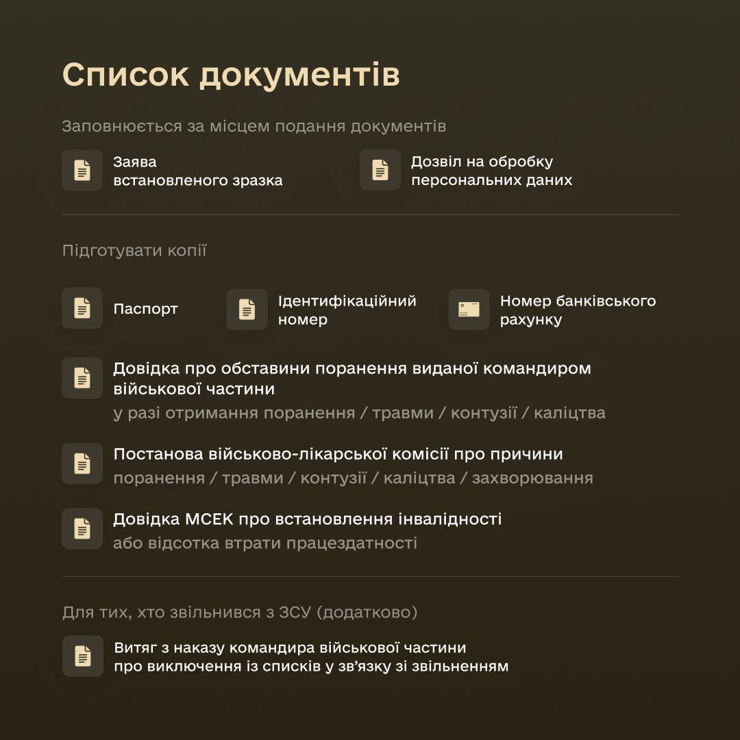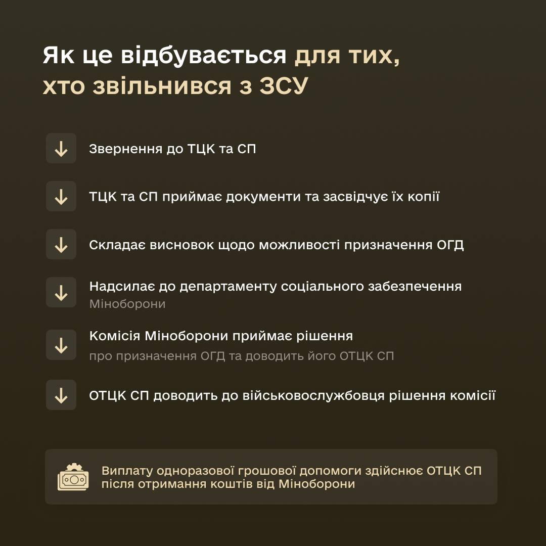 Тим, хто звільнився зі ЗСУ, потрібно звернутися до ТЦК та СП, де військовослужбовець перебуває на обліку. ТЦК та СП приймає документи та засвідчує їх копії і складає висновок щодо можливості призначення ОГД, який надсилається до департаменту соціального забезпечення Міноборони.