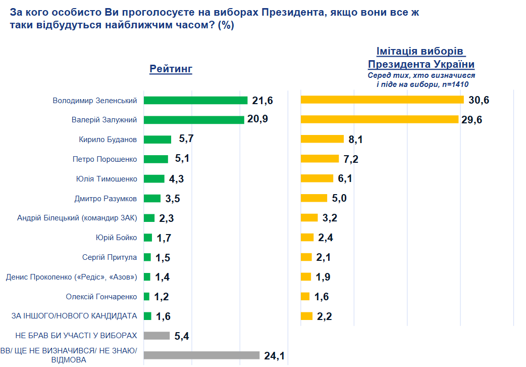 Якби президентські вибори в Україні відбулися найближчим часом, у другий тур вийшли б чинний президент Володимир Зеленський і нинішній посол України в Великій Британії генерал Валерій Залужний.