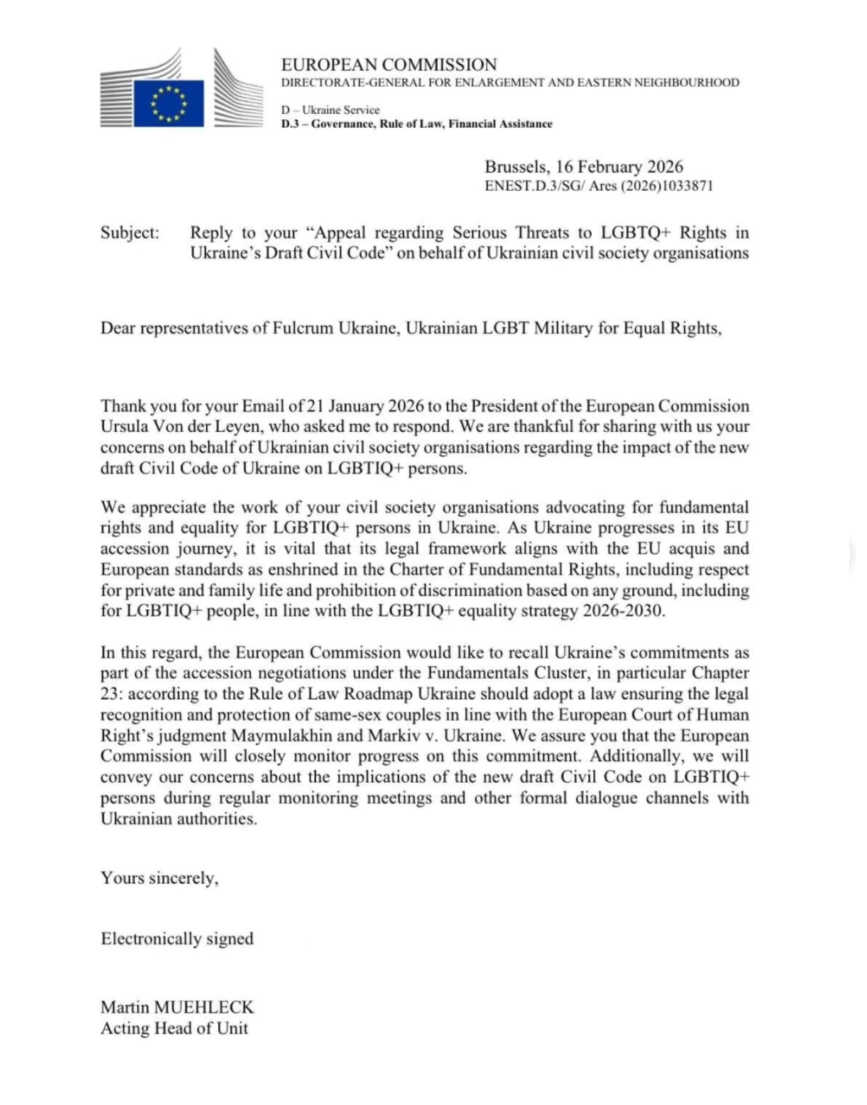Громадська організація “Точка опори” та об’єднання “Українські ЛГБТ+ військові та ветерани за рівні права” звернулися з офіційним листом до Єврокомісії, у якому правозахисники звернули увагу європейських інституцій на норми законопроєкту, які, за їхньою оцінкою, істотно звужують правовий захист для одностатевих пар.