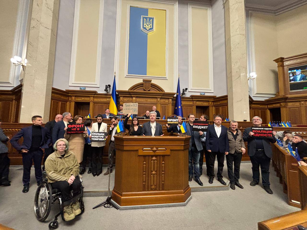 Фракція “Європейська солідарність” заблокувала трибуну з вимогою відставки уряду. Голова Верховної Ради Руслан Стефанчук оголосив перерву.