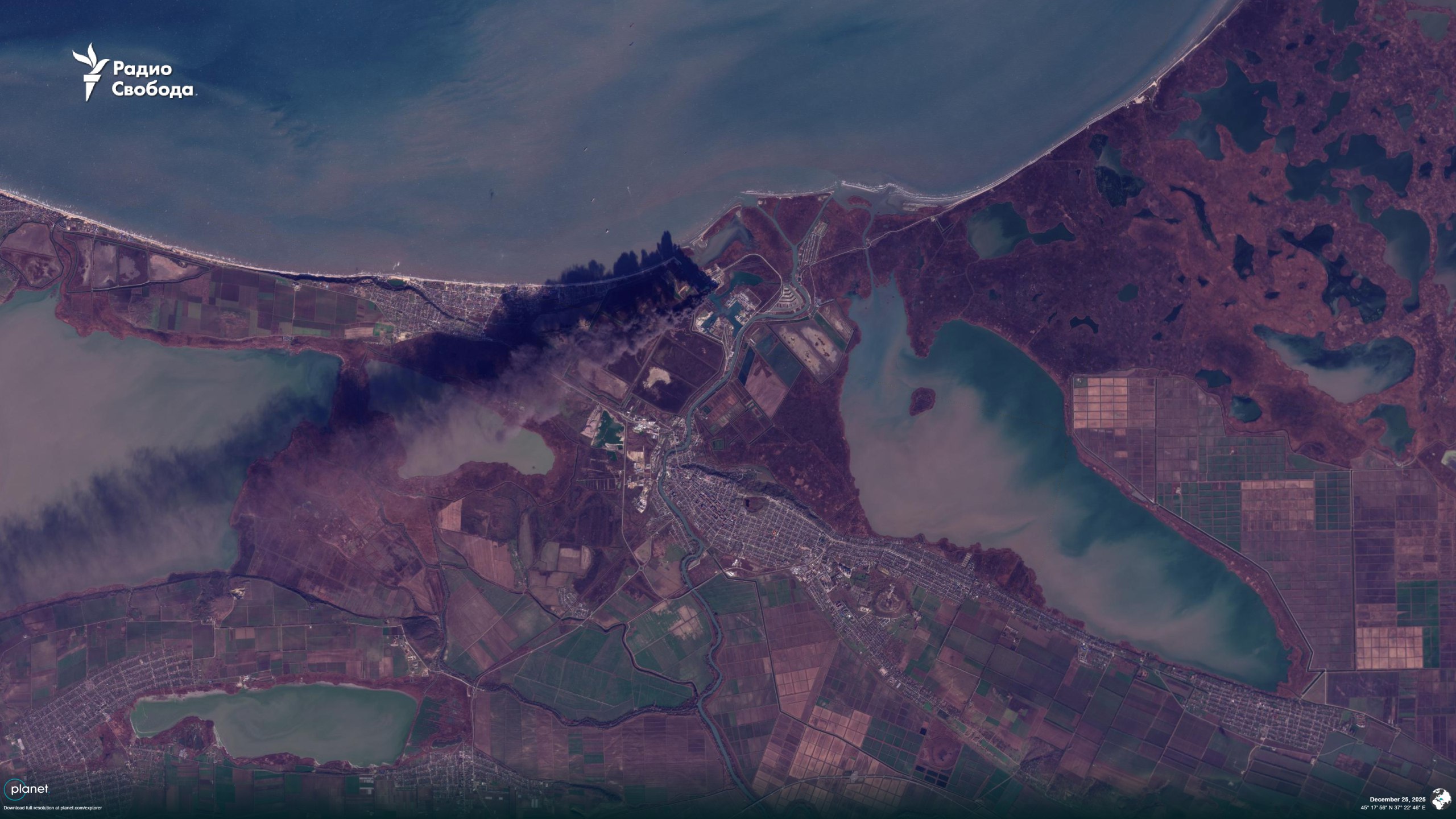ЗМІ опублікували супутникові знімки наслідків удару Сил оборони України по російському порту “Темрюк”, розташованого у затоці Азовського моря на Таманському півострові у Краснодарському краї РФ.