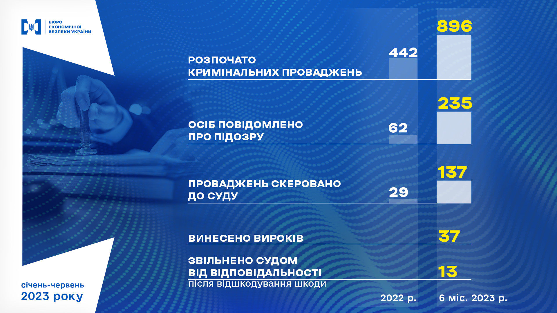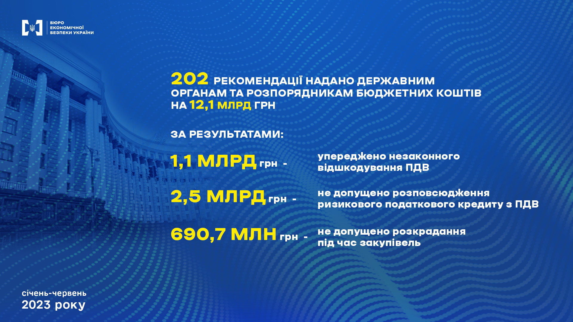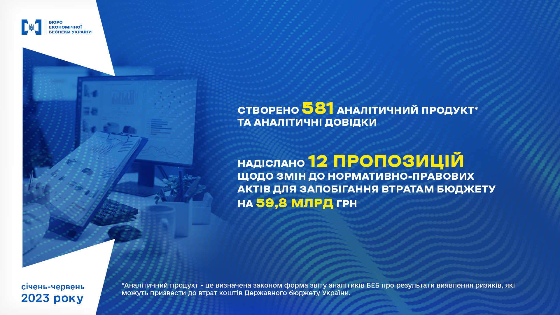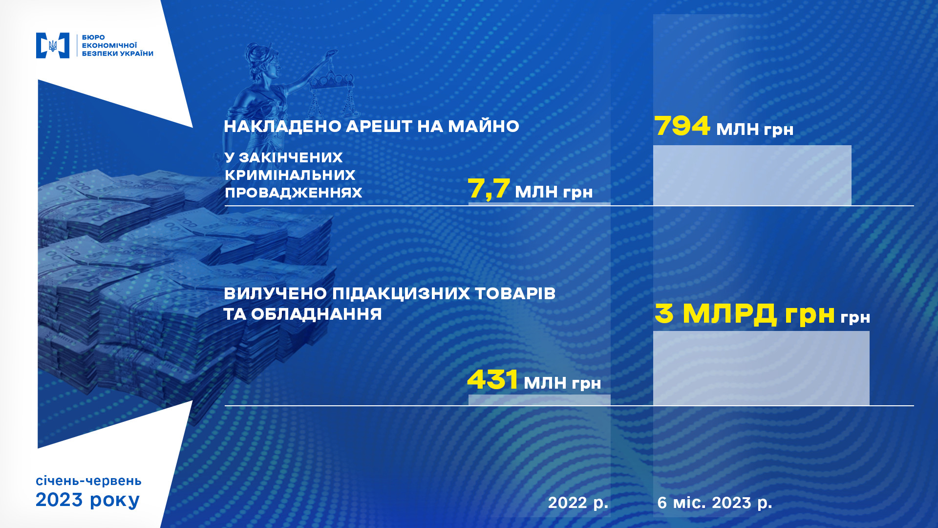 Зауважується, що попри недостатнє фінансування та укомплектованість органу всього на 20% загальної чисельності, працівники БЕБ забезпечили відшкодування до бюджету у 1,6 млрд грн. Також упередили розтрату державних коштів на суму у 1,79 млрд грн, окрім цього, вилучили підакцизних товарів на 3 млрд грн.