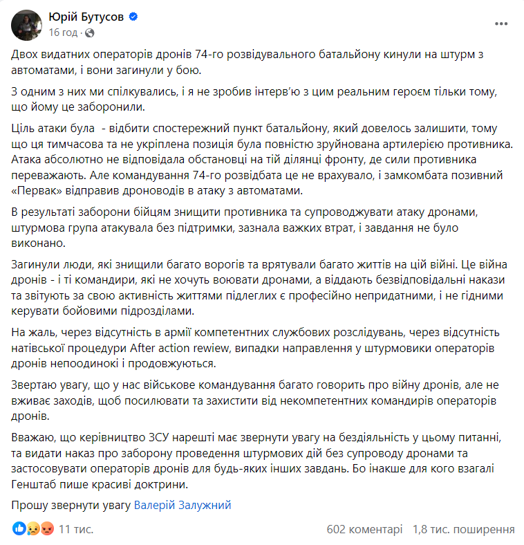 Головнокомандувач Збройних сил України генерал Валерій Залужний прокоментував допис журналіста, головного редактора видання “Цензор. НЕТ” Юрія Бутусова про те, що двох операторів безпілотників 74-го розвідувального батальйону кинули на штурм з автоматами, внаслідок чого вони загинули в бою.