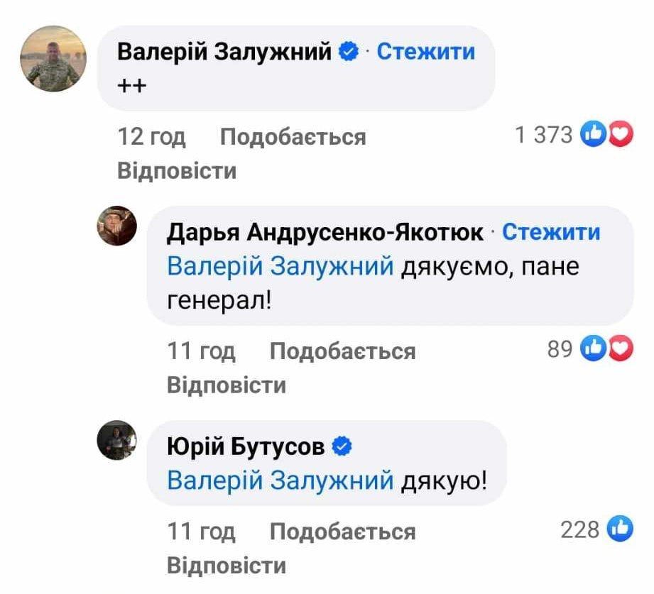 У коментарях під цим дописом Валерій Залужний лаконічно відповів, поставивши два плюсики: “++”.