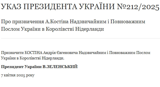 Зеленський призначив ексгенпрокурора Костіна послом у Нідерландах