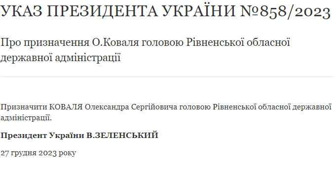 Також 12 грудня Кабмін погодив кандидатуру Олександра Коваля на посаду голови Рівненської ОДА.