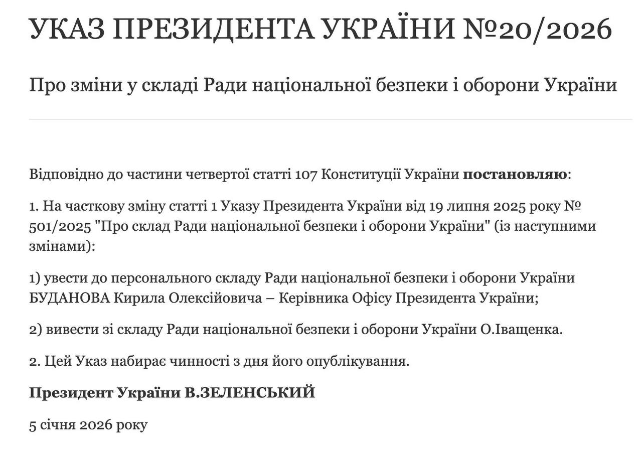 У понеділок, 5 січня, президент Володимир Зеленський підписав низку указів, які суттєво змінюють персональний склад вищих органів безпеки країни. Згідно з офіційними документами, до складу Ради національної безпеки і оборони України було введено керівника Офісу Президента Кирила Буданова.