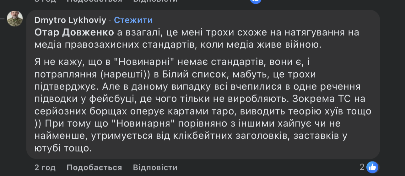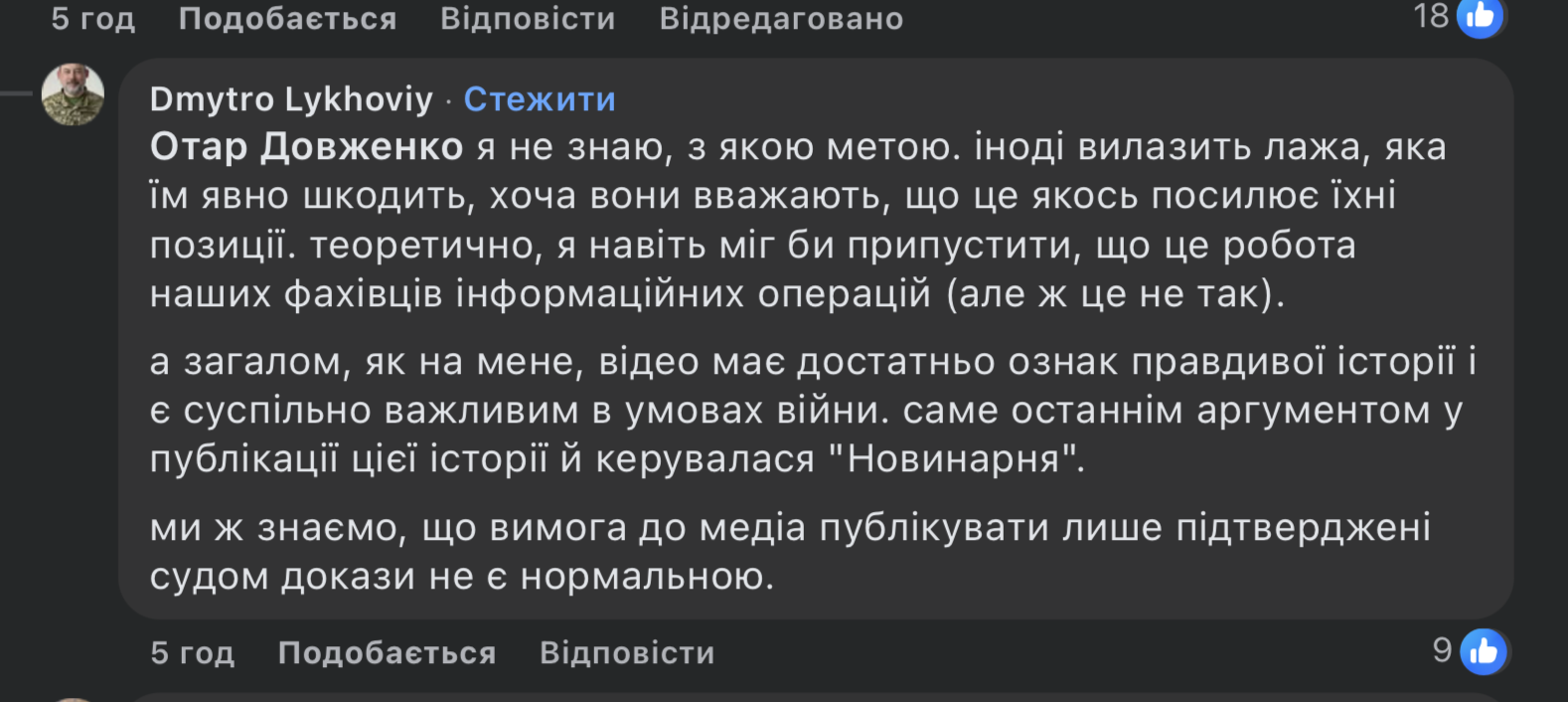 “Як на мене, відео має достатньо ознак правдивої історії і є суспільно важливим в умовах війни. саме останнім аргументом у публікації цієї історії й керувалася “Новинарня”. Ми ж знаємо, що вимога до медіа публікувати лише підтверджені судом докази не є нормальною”, – написав він.