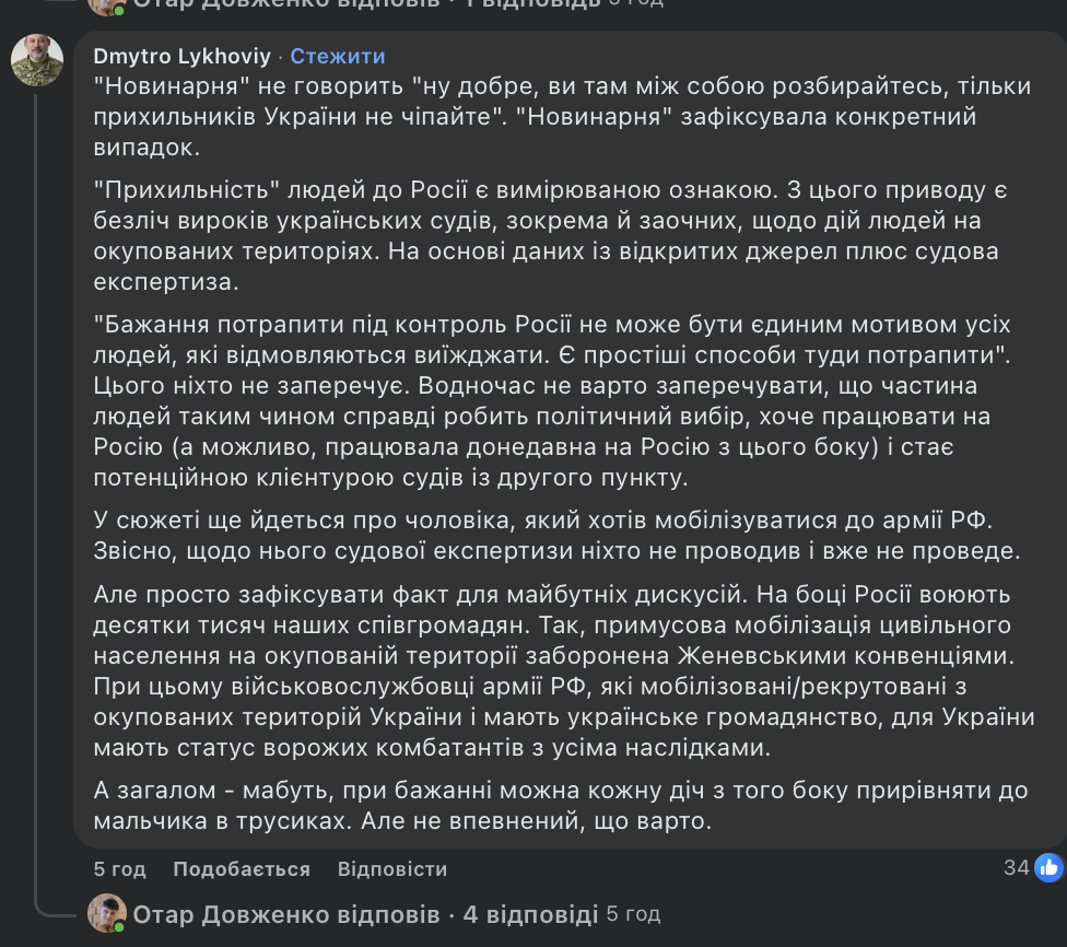 Водночас головний редактор “Новинарні” та військовослужбовець Дмитро Лиховій у відповідь заявив, що відео має достатньо ознак правдивості, а редакція зафіксувала конкретний випадок. Він наголосив, що прихильність до Росії у частини мешканців окупованих територій є реальним явищем і в низці випадків підтверджується судовими вироками.