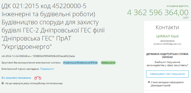 Журналісти проєкту “Наші гроші” виявили у системі “Прозорро”, що підряд на 4,36 млрд грн припав на будівництво захисту Дніпровської ГЕС. Замовлення отримало ТОВ “БК “Адамант”, що раніше входило в корпорацію “Укрбуд”.