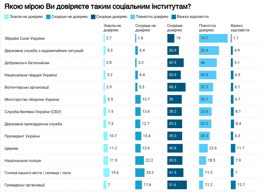 Серед державних та суспільних інститутів найбільше українці довіряють Збройним Силам України (94% опитаних), добровольчим батальйонам (89%), волонтерським організаціям (86%), ДСНС (83%) та Нацгвардії України (82%).