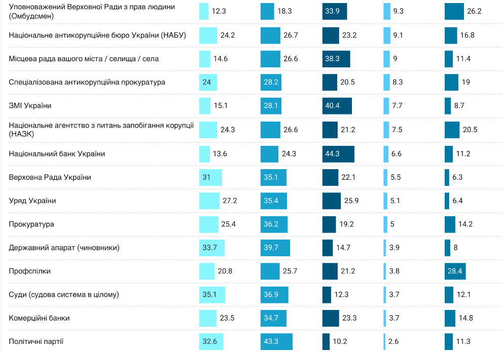 Найбільше ж не довіряють політичним партіям (76%), державному апарату (73%), судам (72%), Верховній Раді України (66%) та уряду України (63%).