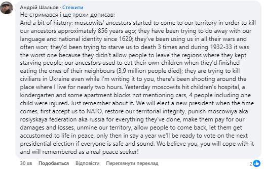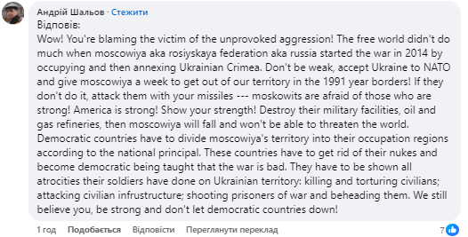 Не будьте слабкими, прийміть Україну в НАТО і дайте москві тиждень покинути нашу територію в кордонах 1991 року! Якщо вони цього не зроблять, атакуйте їх своїми ракетами… московити бояться сильних! Америка сильна! Покажи свою силу!