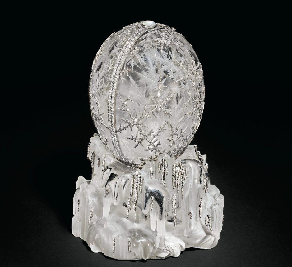 “Зимове яйце” виготовлене з гірського кришталю та оздоблене платиновими сніжинками, інкрустованими діамантами. За словами спеціалістів Christie’s, це один із найвитонченіших виробів Фаберже, створених для імператорської родини.